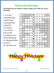 Thanksgiving Word Scramble - Here's an entertaining Thanksgiving Word Scramble puzzle with a twist! Discover a timely hidden message after you unscramble all 15 words correctly. The theme of this page is gratitude. Solve on your own or with a group. Share with family and friends this season!